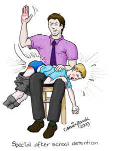 Auch die eine oder andere längere Auszeit, natürlich mit blankem leuchtend rotem Po, in der Zimmerecke oder in Reichweite direkt neben der Couch wäre denkbar, bevor es nochmal übers Knie oder bei schwerwiegendem Fehlverhalten auch mal über die Sessellehne, Tischkante o.ä. Vorrichtungen geht und die Strafe mit ein, zwei größeren üblichen Züchtigungshelfern (z.B. Gürtel, Rohrstock, Teppichklopfer, Reitgerte, Holz-/Lederpaddle, u.ä.) fortgesetzt wird.